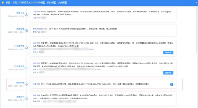 库代力克村、闹音呼都克村3小时降雨量54.0毫米,平台自动触发立即转移预警(预警阈值46.0毫米),并通过电话“叫应”责任人,提醒做好人员转移避险工作。