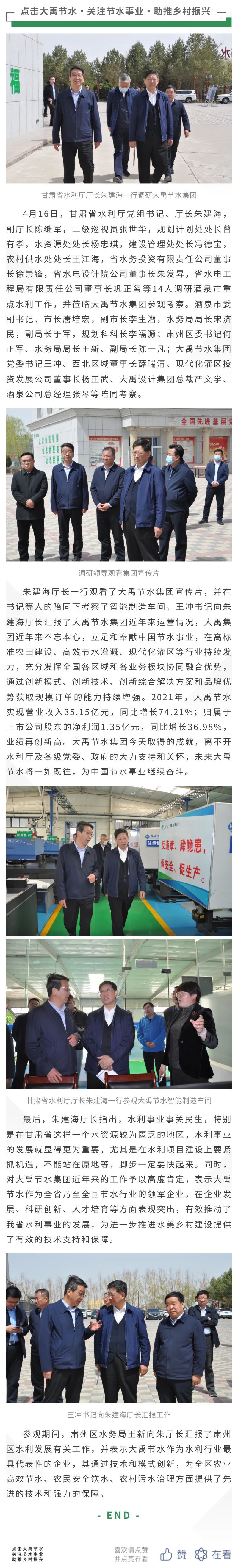 大禹动态| 甘肃省水利厅厅长朱建海带队考察省重点水利工程莅临大禹节水参观调研