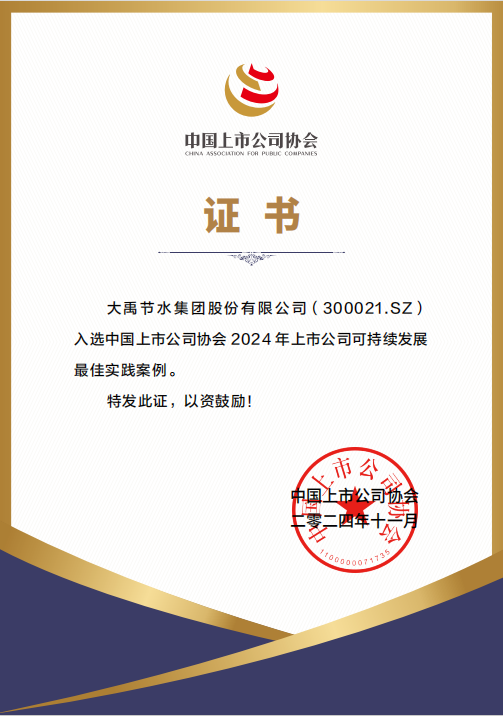 在“2024年上市公司董事会优秀实践案例”评选中,大禹节水凭借董事会透明、合规、高效的运作模式,以及持续提升公司治理水平的卓越表现脱颖而出。大禹节水通过完善治理结构、夯实可持续发展基础,展现了在推动生态文明建设和履行社会责任方面的优秀实践。