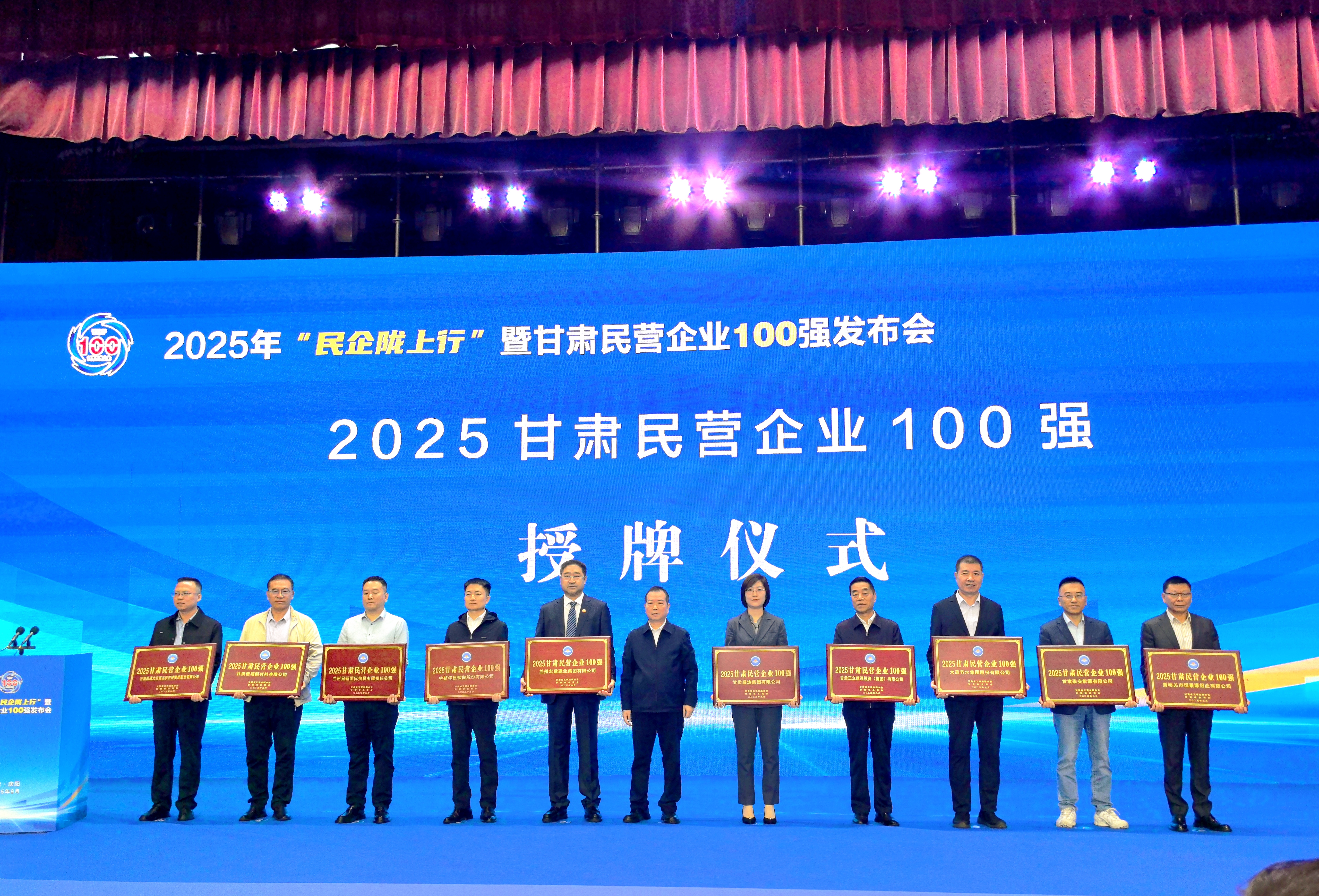 9月29日,2025 年 “民企陇上行” 暨甘肃民营企业100强发布会在庆阳隆重召开,甘肃省委常委、统战部长、省政协党组副书记孙雪涛出席,省委统战部副部长、省工商联党组书记刘全平及庆阳市委书记黄泽元莅临致辞,省工商联主席郭奇志发布2025甘肃民营企业100强榜单;省委统战部副部长、省工商联党组书记刘全平,省发展改革委党组成员、副主任周立荣,庆阳市委副书记、市长周继军共同为 “2025甘肃民营企业100强” 代表授牌,发布会由甘肃省工商联党组成员、副主席毛赟主持。