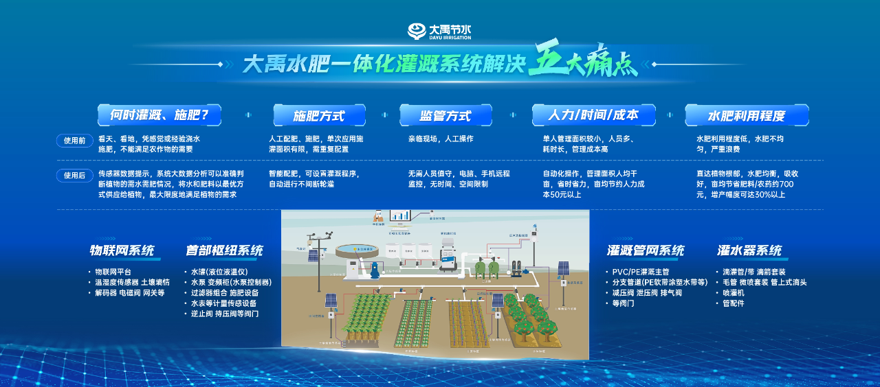 大禹集团始终聚焦农田水利事业,坚持以科技创新为优质农产品生产端筑牢根基,在科技研发、模式创新、产业链整合三大方向上持续深耕,构建起以水肥一体化系统为核心的全场景一站式解决方案。该方案可有效解决传统种植中“看天、看地、凭经验”的痛点,实现节水、节肥、增产、增效,为高端农业品牌提供品质“稳定器”、绿色“通行证”和降本“增效器”。