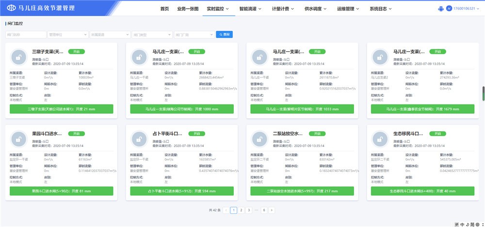 系统基于一工程一档案,一渠一档案以及一协会一档案的逻辑进行建设,基于不同维度查询所有相关信息。如点击闸门节点,可对闸门进行远程实时监控和查阅相关信息,实时监控包括:闸门开度、实时流量、累计水量、水位、远程控制。