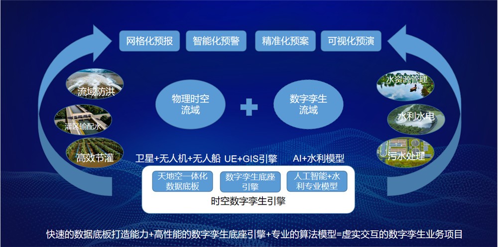 基于空天地一体化的数据底板、高效渲染、场景灵活配置的数字孪生底座引擎以及智能专业算法模型,生成虚实交互、协同映射的流域数字孪生工程,实现流域业务的网格化预报、智能化预警、精准化预案、可视化预演。