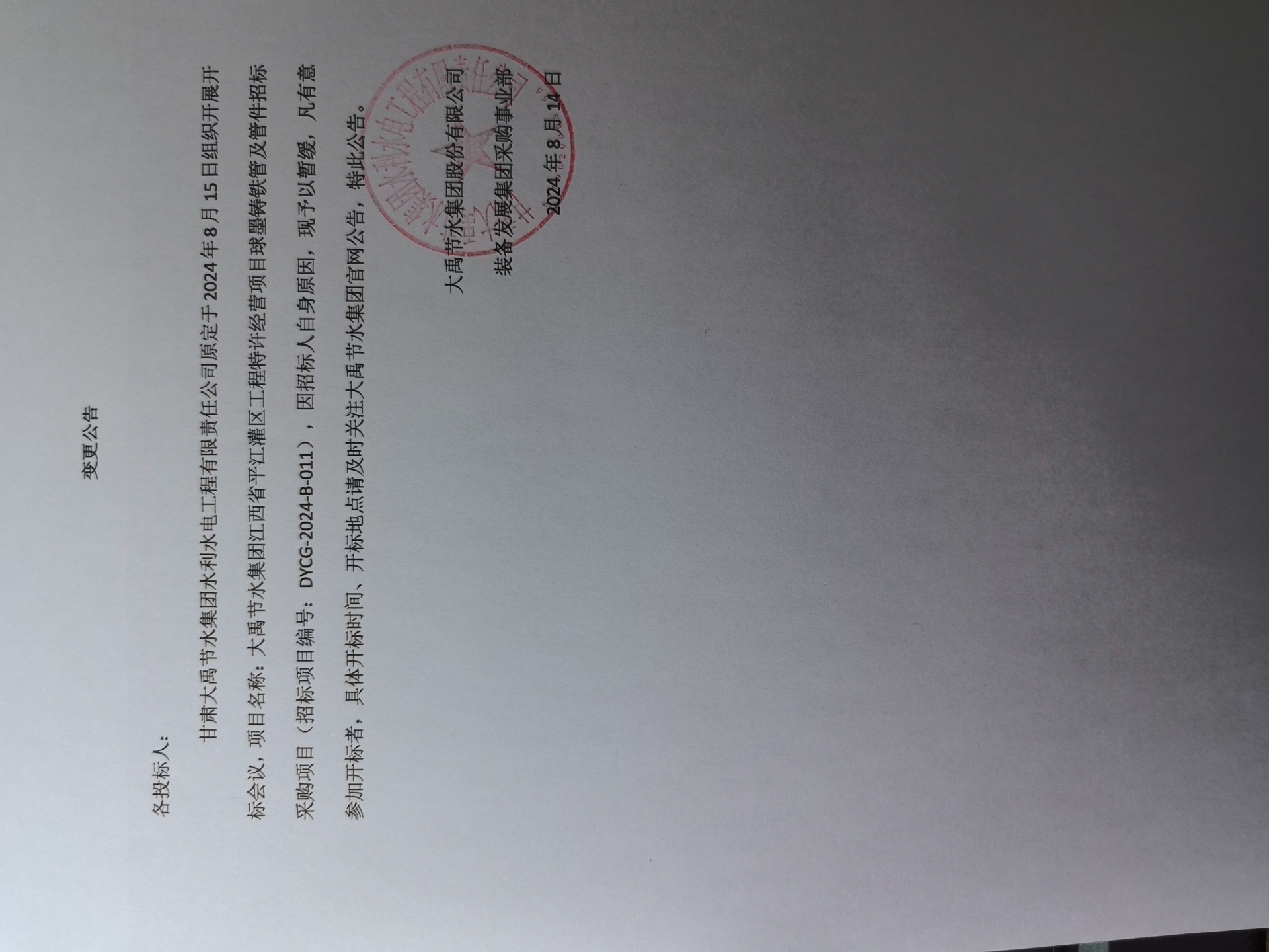 大禹节水集团股份有限公司因经营发展需要,对大禹节水集团江西省平江灌区工程特许经营项目球墨铸铁管及管件进行公开招标采购,真诚欢迎符合条件的供应商前来投标。